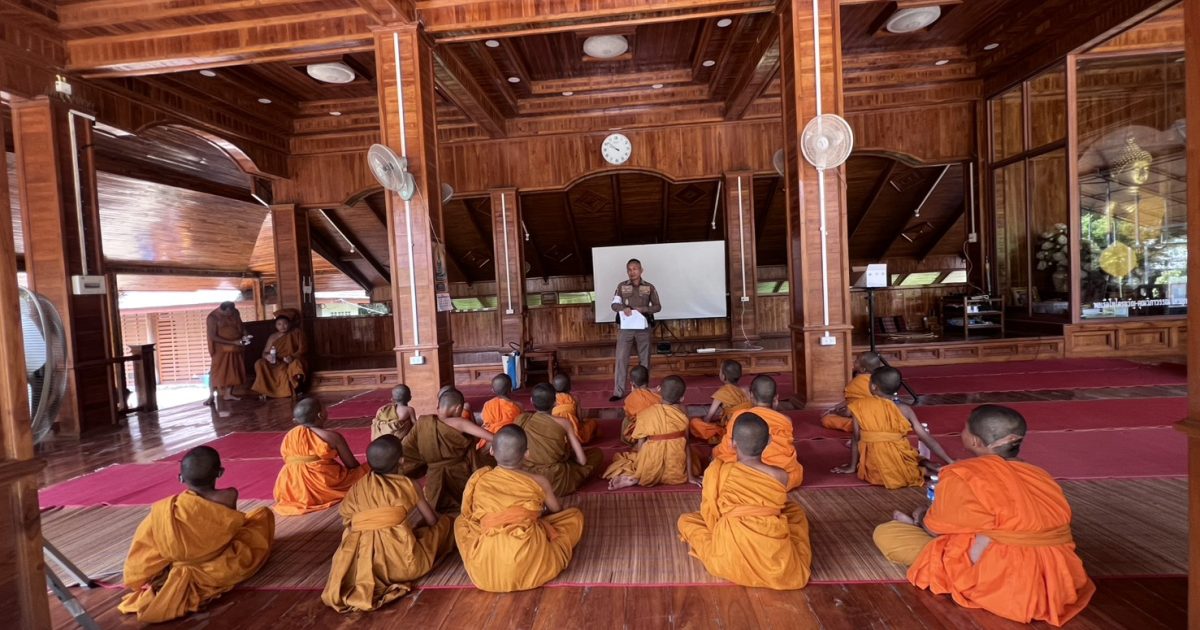 รอง สว.จร.สภ.สหัสขันธ์ ร้อยเวร 60 พร้อมด้วยจราจรเวร เป็นวิทยากร อบรมบรรยาย ให้ความรู้เรื่องยาเสพติด และโทษของยาเสพติด ให้กับ สามเณรภาคฤดูร้อนวัดป่ามงคลธรรมรังษี