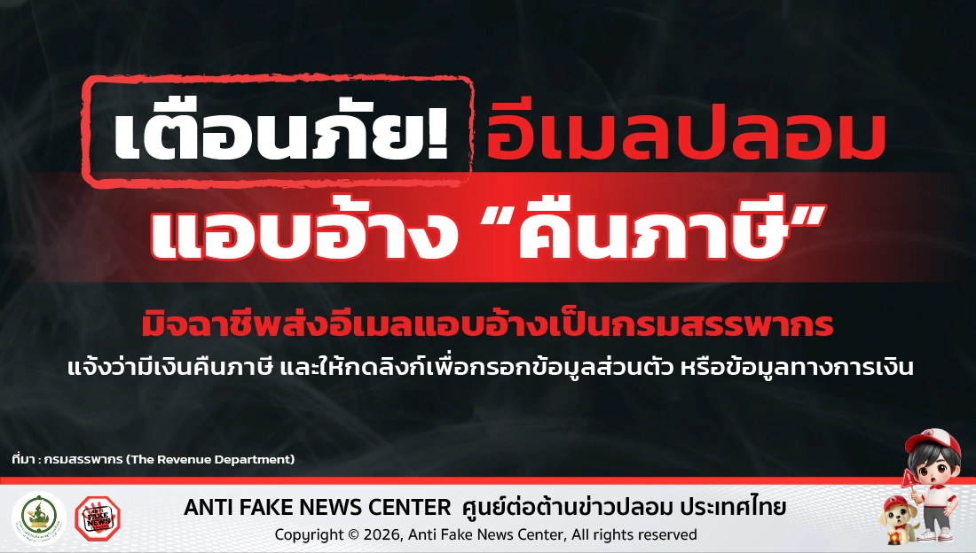 มิจฉาชีพส่งอีเมลแอบอ้างเป็นกรมสรรพากร แจ้งว่ามีเงินคืนภาษี และให้กดลิงก์เพื่อกรอกข้อมูลส่วนตัวหรือข้อมูลทางการเงิน