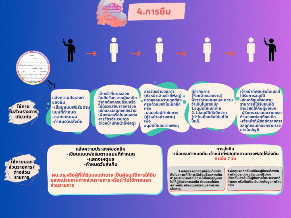 4.  กำหนดแนวทางการยืมหรือเบิกจ่ายทรัพย์สินของราชการหรือของบริจาคไปใข้ปฏิบัติงานที่ชัดเจน