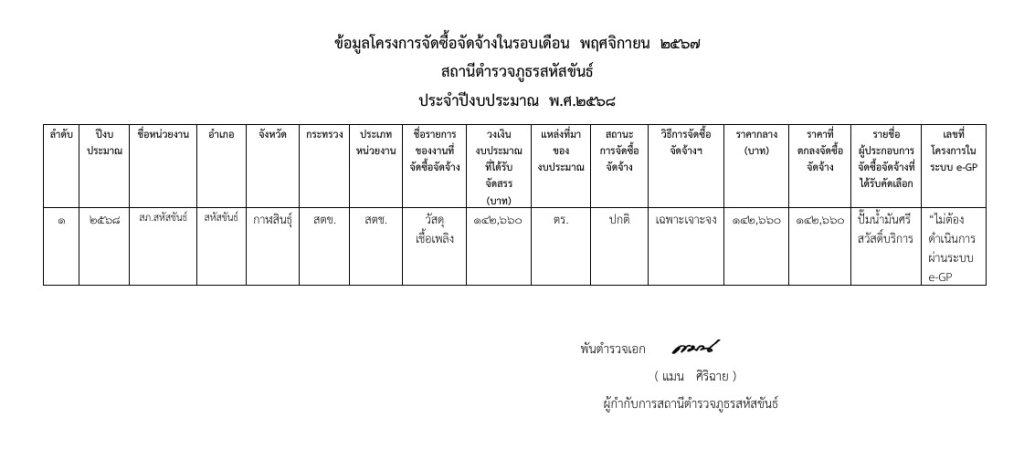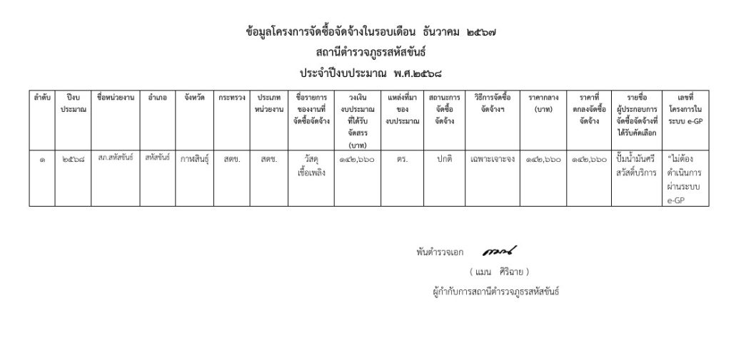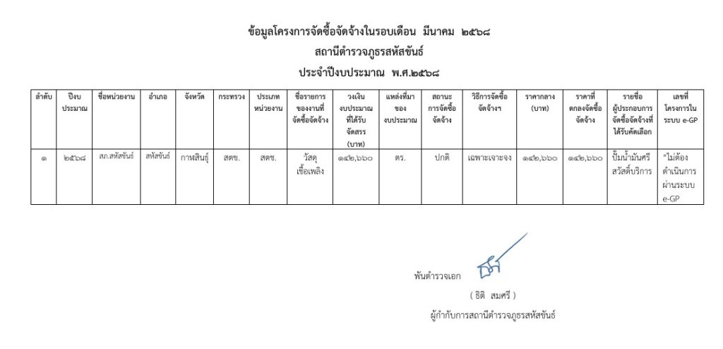สถานีตำรวจภูธรสหัสขันธ์ ได้สรุปผลการดำเนินการจัดซื้อจัดจ้างรายเดือนในรอบ 6 เดือนแรกของปีงบประมาณ พ.ศ.2568 (ตุลาคม 2567 – มีนาคม 2568)